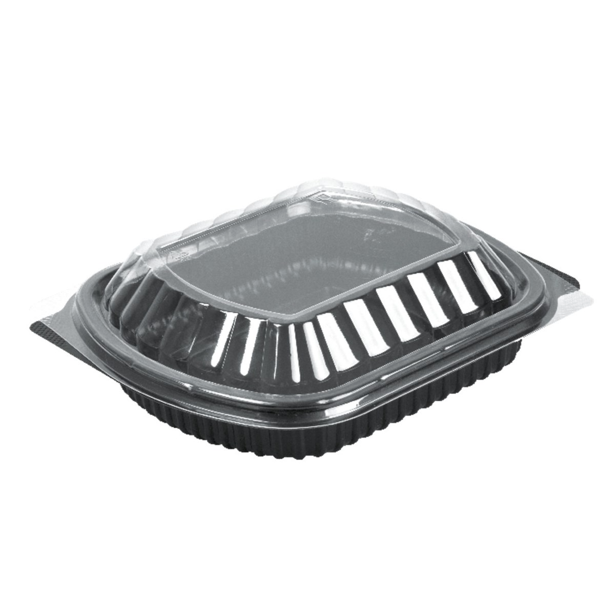 Dark grey container with a transparent lid, made of recyclable polypropylene. Size: 210mm (W) x 41.39mm (H). Comes in 10 packs of 25 (total 250 per case). BRC certified.